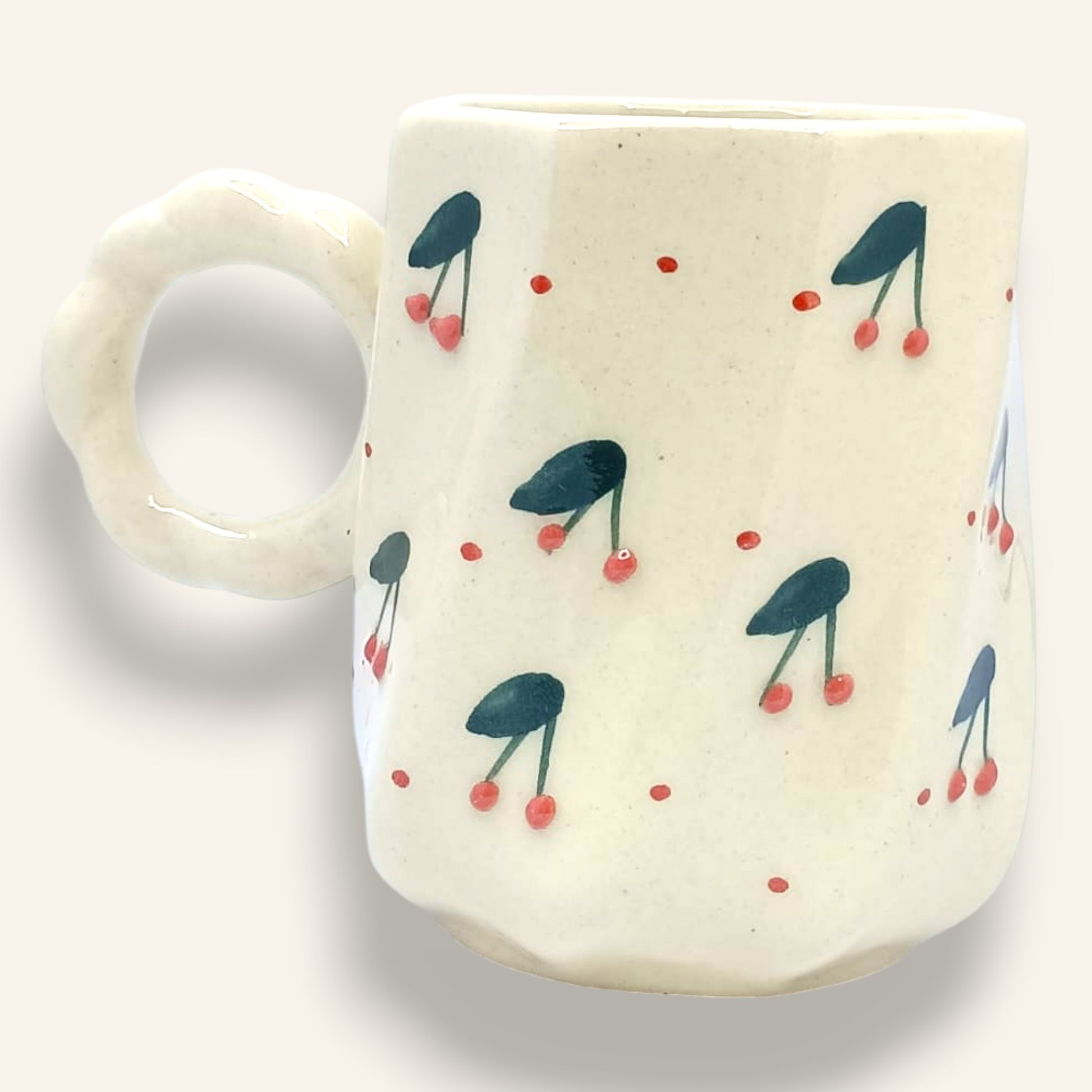 Add a fruity twist to your everyday sip with this handmade ceramic mug, decorated with playful cherry-inspired red berries and leafy accents. Its textured wavy handle adds an artisanal touch, making it not just a mug but a piece of functional art. Perfect for coffee, tea, or hot chocolate, this mug is cheerful, stylish, and a wonderful gift for someone special.