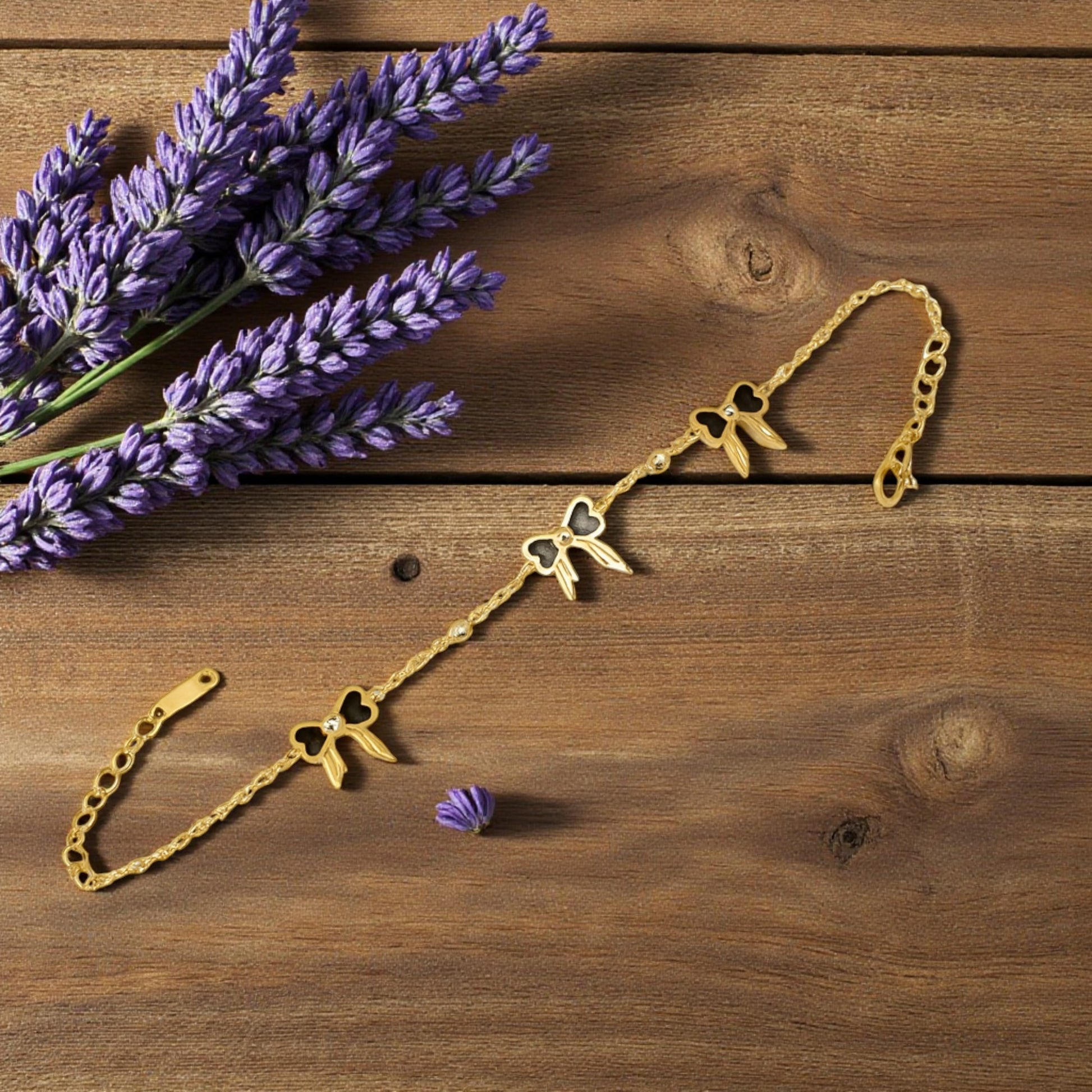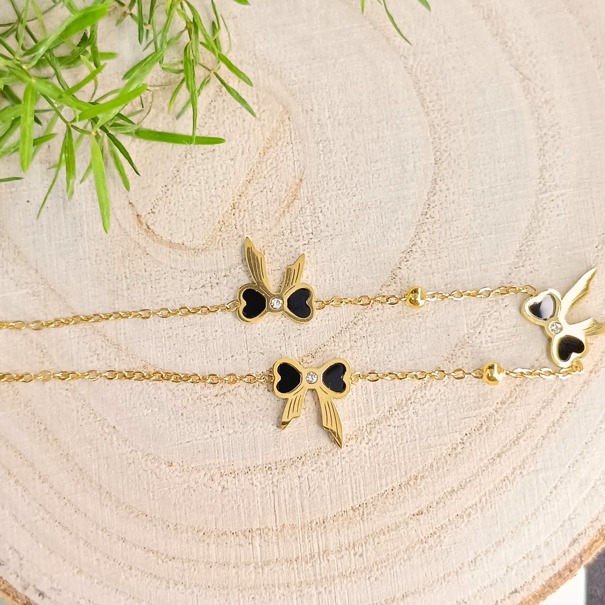 Playful yet elegant, the Black Bow Charm Bracelet is designed to add a chic touch to your everyday style. Crafted from premium stainless steel with an anti-tarnish finish, this bracelet features dainty black enamel bow charms accented with delicate stones for a subtle sparkle. Lightweight and adjustable, it’s perfect for layering or wearing as a statement piece on its own.