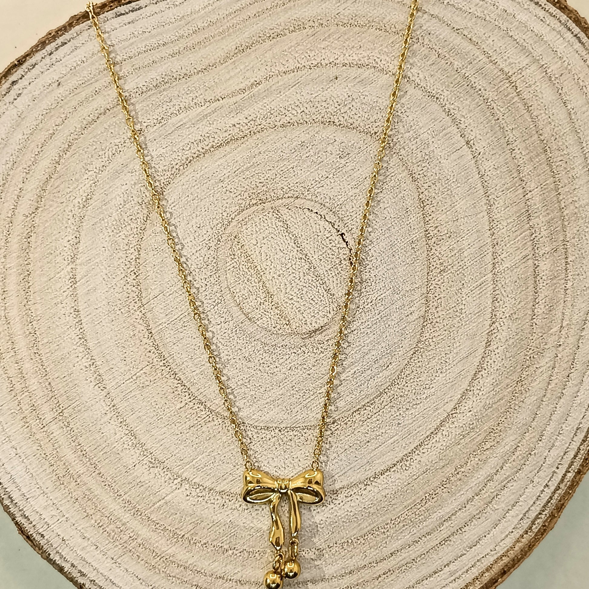 - Charming gold-toned bow-shaped pendant with dangling accents