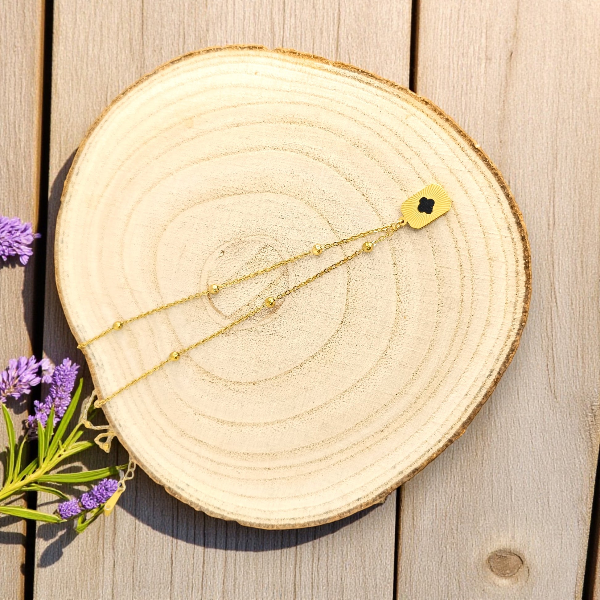- Elegant gold-toned necklace featuring a rectangular pendant with a black clover design