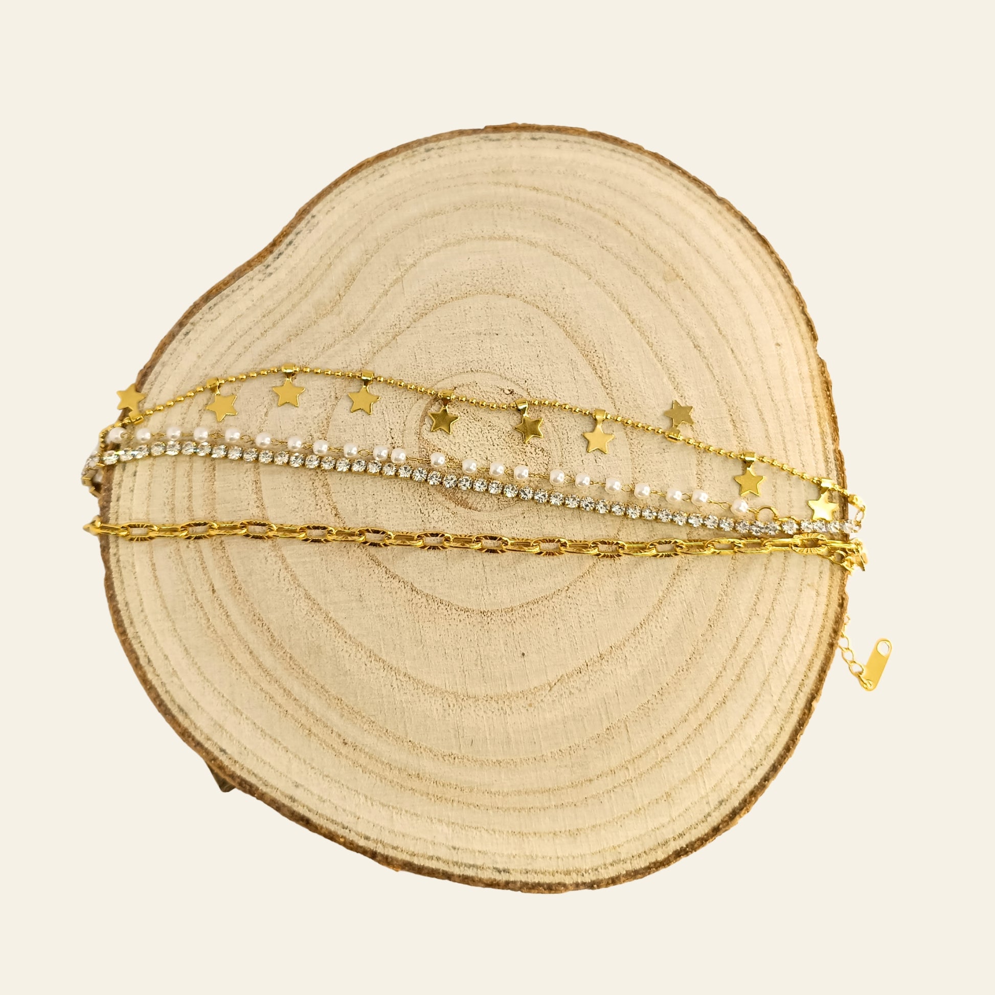 - Chic multi-layered bracelet combining golden star charms, dainty pearls, and sparkling rhinestones