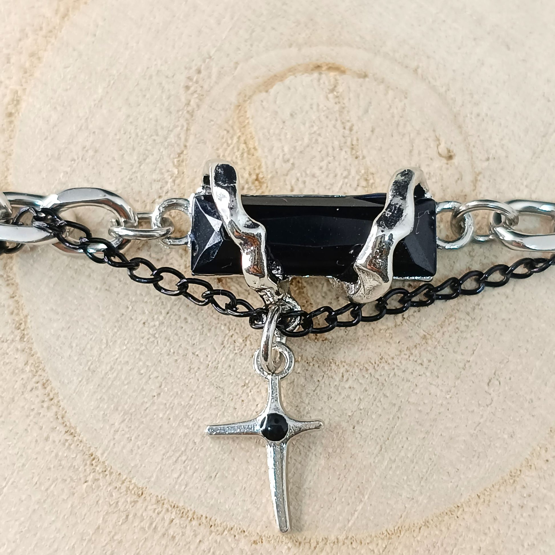 Make a statement with this bold bracelet featuring a striking black stone centerpiece, layered chains, and a dangling cross charm. Crafted in stainless steel with black accents, this bracelet blends gothic style with modern streetwear fashion. Perfect for men who want to stand out.