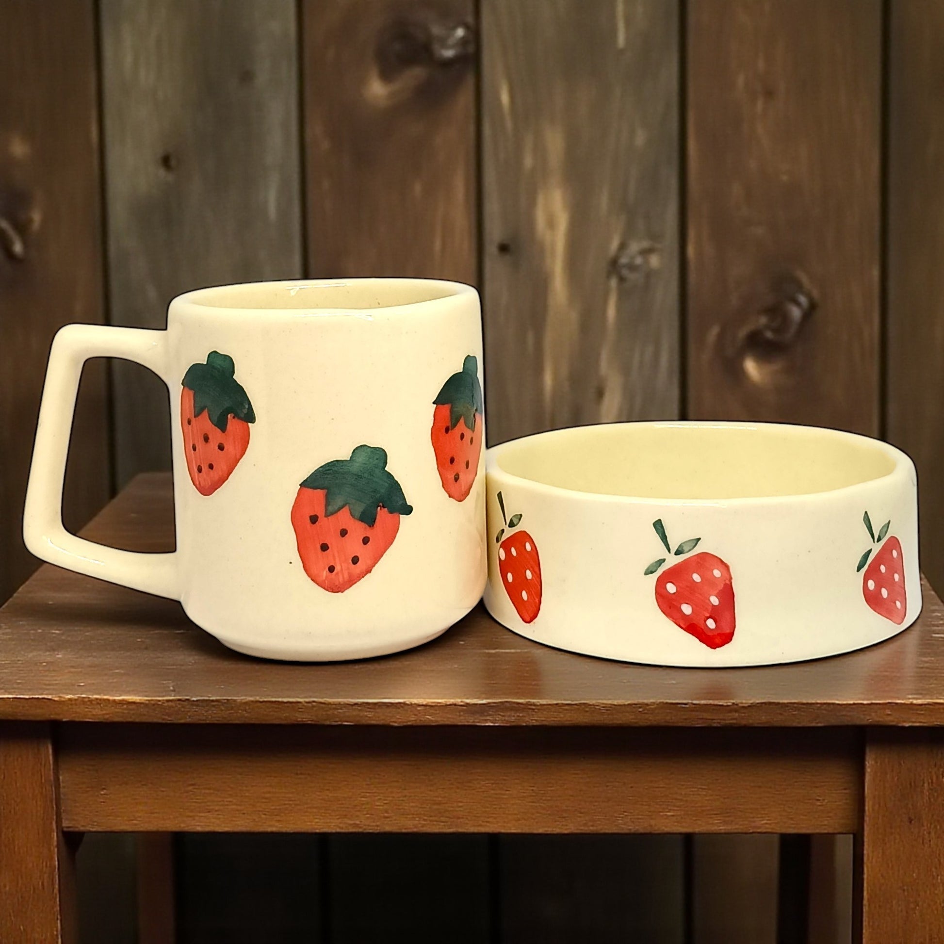 - 🍓 Playful hand-painted strawberry design on both mug & bowl
