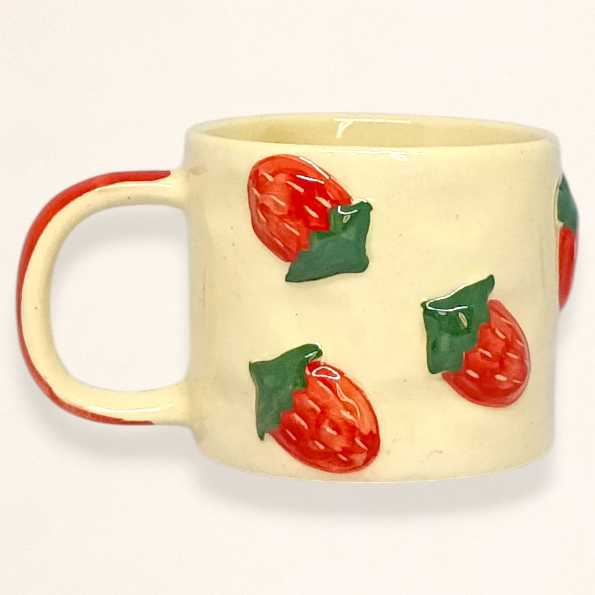 Sip in sweetness with this charming handmade ceramic mug, featuring raised strawberry details and a soft ivory base. The hand-painted red and green accents give it a fresh, cheerful look that brightens every tea or coffee moment. A cozy pick for daily use and a delightful gift for fruit lovers!
